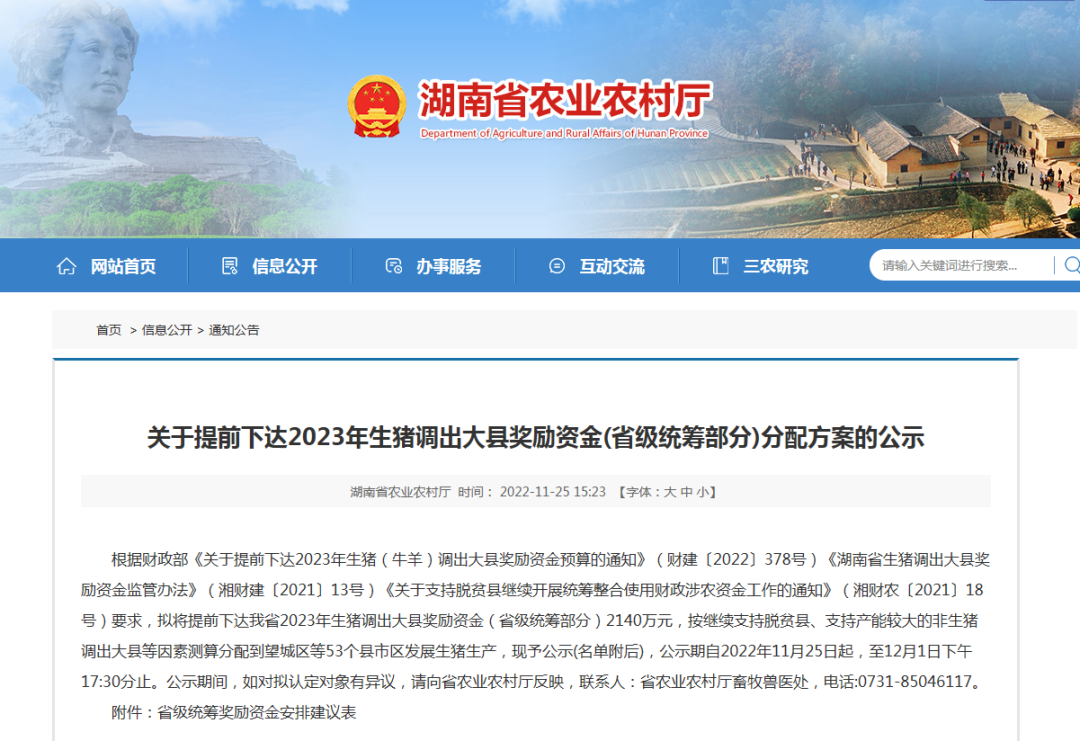 近日,河南、湖南、海(hǎi)南等地發布通知,提前下達2023年中央財政生豬調出大縣獎(jiǎng)勵資金(jīn),其中河南省是中央財政部分,湖南和海南是省級統籌部分,一起(qǐ)來看具體情況。