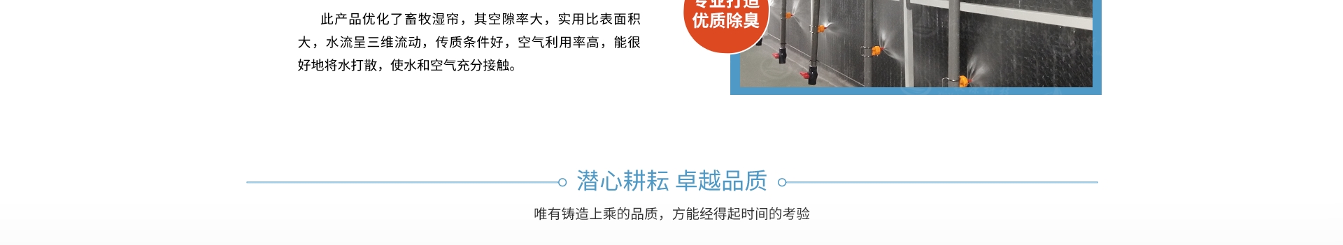 塑料濕(shī)簾也叫除臭濕簾,豬(zhū)舍產(chǎn)生的豬尿、豬糞味會有很多有害(hài)氣體,直接排放不僅會汙染環境,也會有防疫風險(xiǎn)。除臭濕簾安裝在出風口,